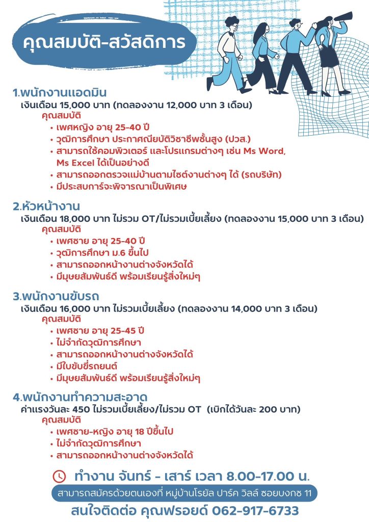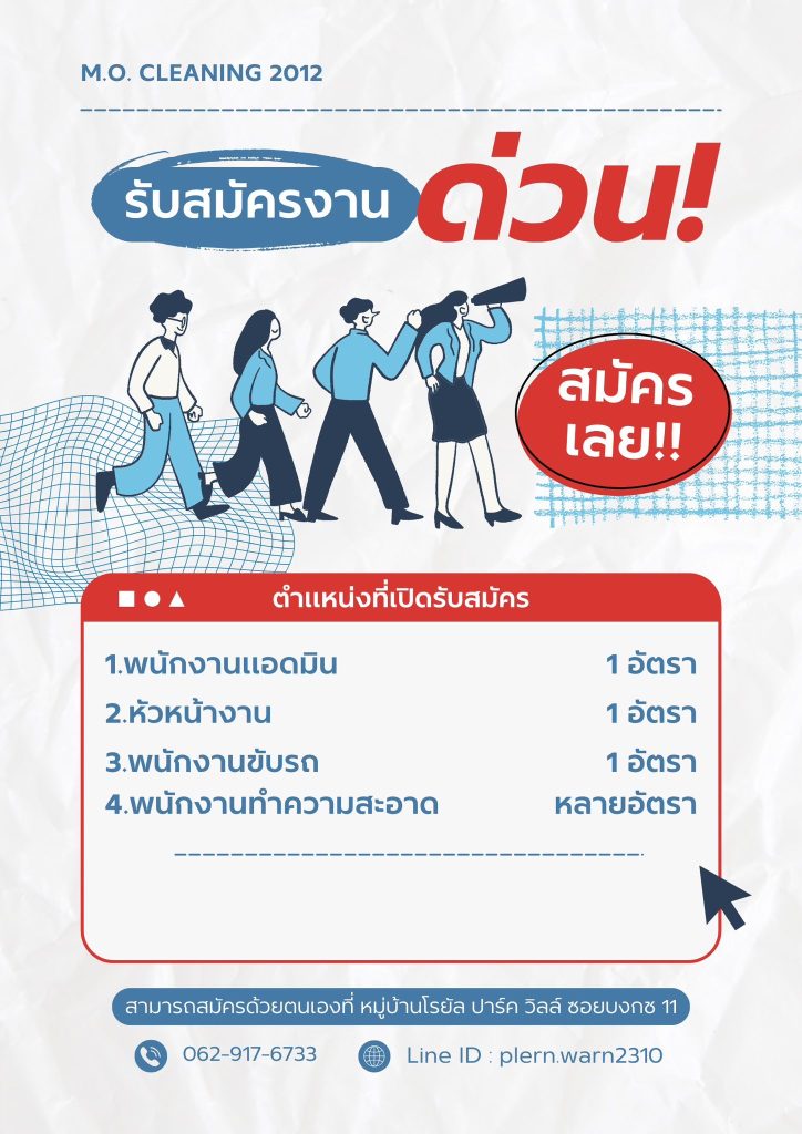 รับสมัครงาน บริษัท เอ็ม.โอ. คลีนนิ่ง 2012 จำกัด ต้องการหาผู้ร่วมงานในตำแหน่งต่างๆ ดังนี้ ตำแหน่งที่รับสมัคร พนักงานแอดมิน 1 ตำแหน่งหัวหน้างาน 1 ตำแหน่งพนักงานขับรถ 1 ตำแหน่งพนักงานทำความสะอาด หลายตำแหน่ง พนักงานแอดมิน เงินเดือน 15,000 บาท (ทดลองงาน 12,000 บาท 3 เดือน)คุณสมบัติเพศหญิง อายุ 25-40 ปีวุฒิการศึกษา ประกาศนียบัตรวิชาชีพชั้นสูง (ปวส.)สามารถใช้คอมพิวเตอร์ และโปรแกรมต่างๆ เช่น MS Word, Excel ได้เป็นอย่างดีสามารถออกตรวจแม่บ้านตามไซต์งานต่างๆ ได้ เดินทางด้วยรถบริษัทมีประสบการณ์จะได้รับการพิจารณาเป็นพิเศษ หัวหน้างาน เงินเดือน 18,000 บาท ไม่รวม OT/เบี้ยเลี้ยง (ทดลองงาน 15,000 บาท 3 เดือน)คุณสมบัติเพศชาย อายุ 25-40 ปีวุฒิการศึกษา ม.6 ขึ้นไปสามารถออกหน้างานต่างจังหวัดได้มีมนุษยสัมพันธ์ที่ดี พร้อมเรียนรุ้สิ่งใหม่ๆ พนักงานขับรถ เงินเดือน 16,000 บาท ไม่รวมเบี้ยเลี้ยง (ทดลองงาน 14,000 บาท 3 เดือน)คุณสมบัติเพศชาย อายุ 25-45 ปีไม่จำกัดวุฒิการศึกษาสามารถออกหน้างานต่างจังหวัดได้มีใบขับขี่รถยนต์มีมนุษยสัมพันธ์ที่ดี พร้อมเรียนรุ้สิ่งใหม่ๆ พนักงานทำความสะอาด ค่าแรงวันละ 450 บาท ไม่รวมเบี้ยเลี้ยง/OT (เบิกเงินได้วันละ 200 บาท)คุณสมบัติเพศชาย-หญิง อายุ 18 ปีขึ้นไปไม่จำกัดวุฒิการศึกษาสามารถออกหน้างานต่างจังหวัดได้ ค่าตอบแทนและสวัสดิการ เบี้ยเลี้ยงพิเศษกรณีออกต่างจังหวัดชุดยูนิเฟอร์มประกันสังคม ทำงาน จันทร์ – เสาร์ เวลา 8:00 – 17:00 น. สนใจสมัครงาน หรือติดต่อสอบถามเพิ่มเติมได้ที่ 062-917-6733 (คุณฟรอยด์)