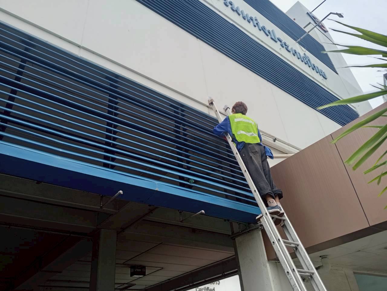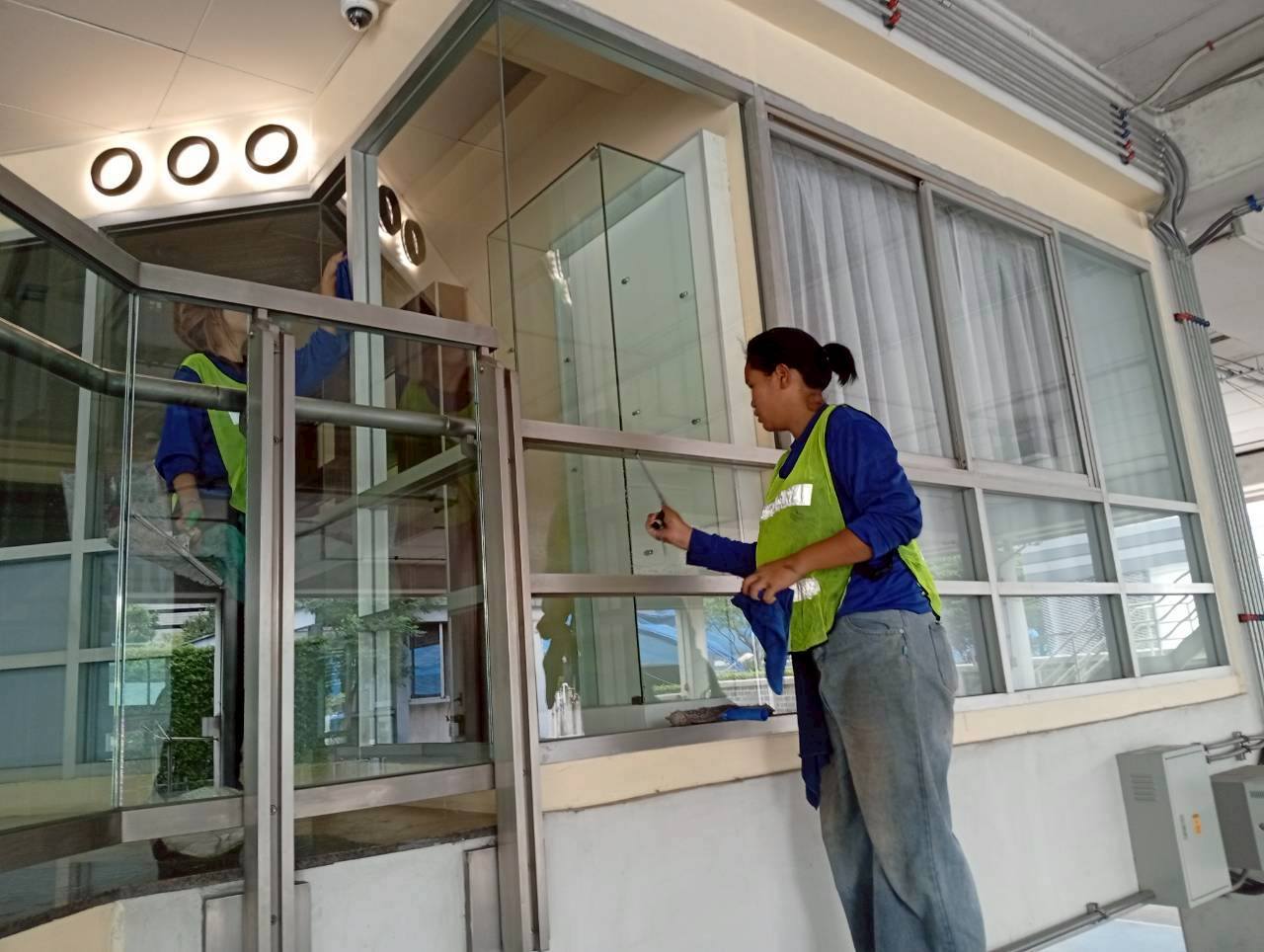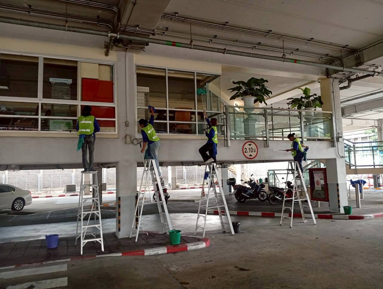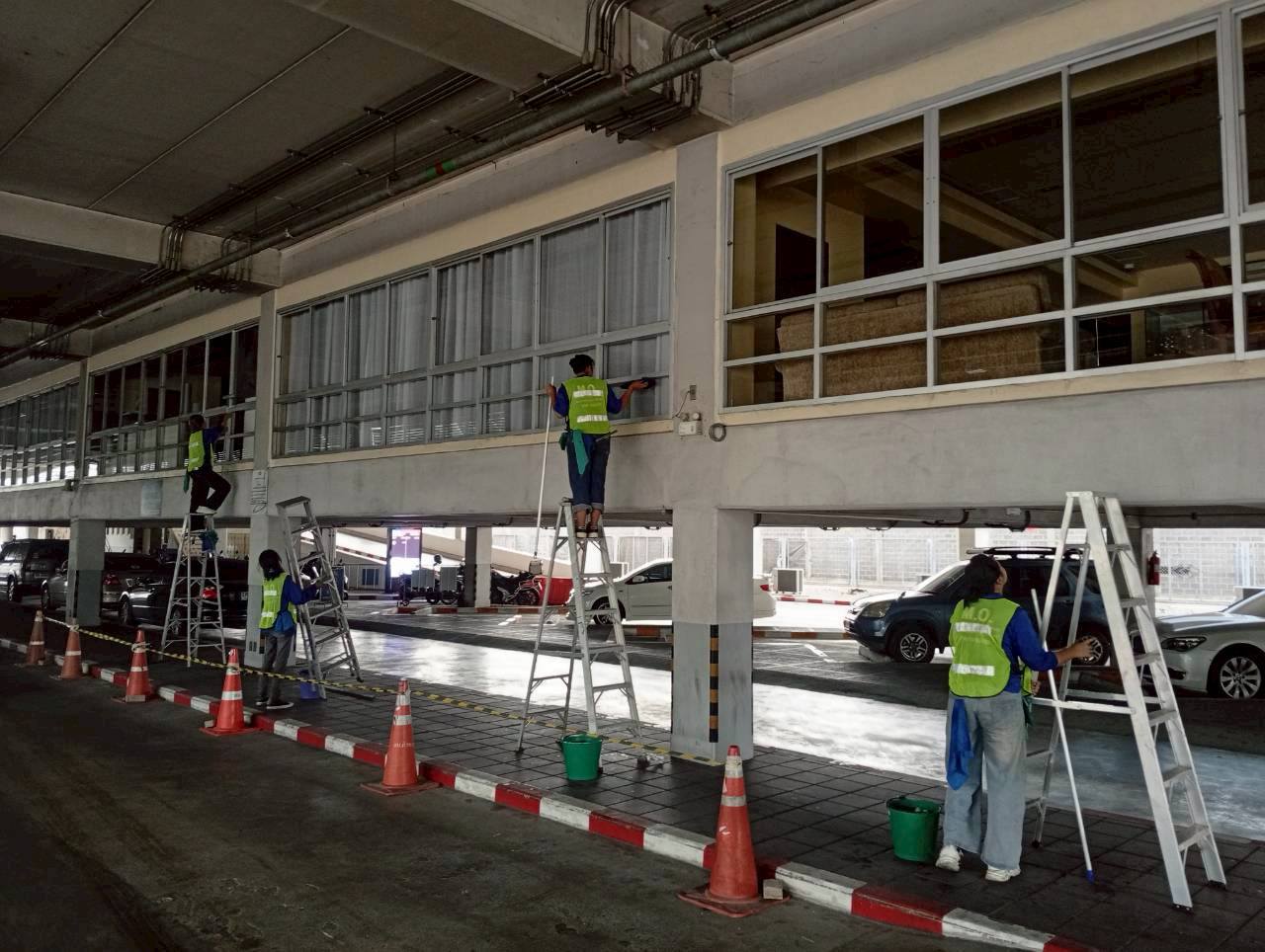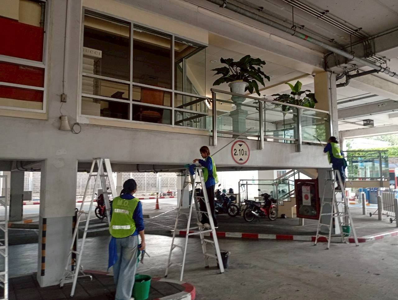 เช็ดฝุ่นและคราบบนผนัง เสาไฟ ป้ายบอกทาง และตู้เก็บบัตร